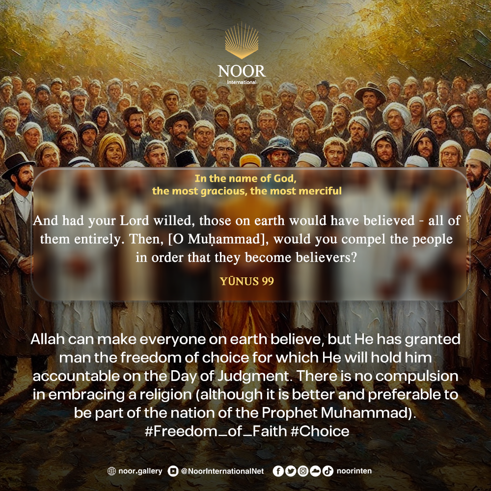 "Allah can make everyone on earth believe, but He has granted man the freedom of choice for which He will hold him accountable on the Day of Judgment.