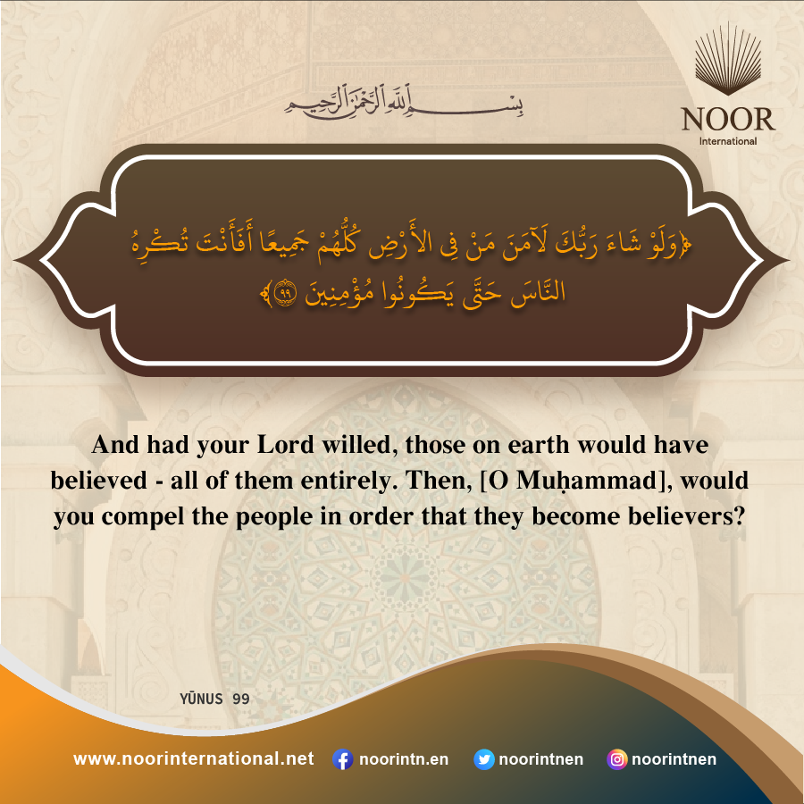 And had your Lord willed, those on earth would have believed – all of them entirely. Then, [O Muúammad], would you compel the people in order that they become believers?