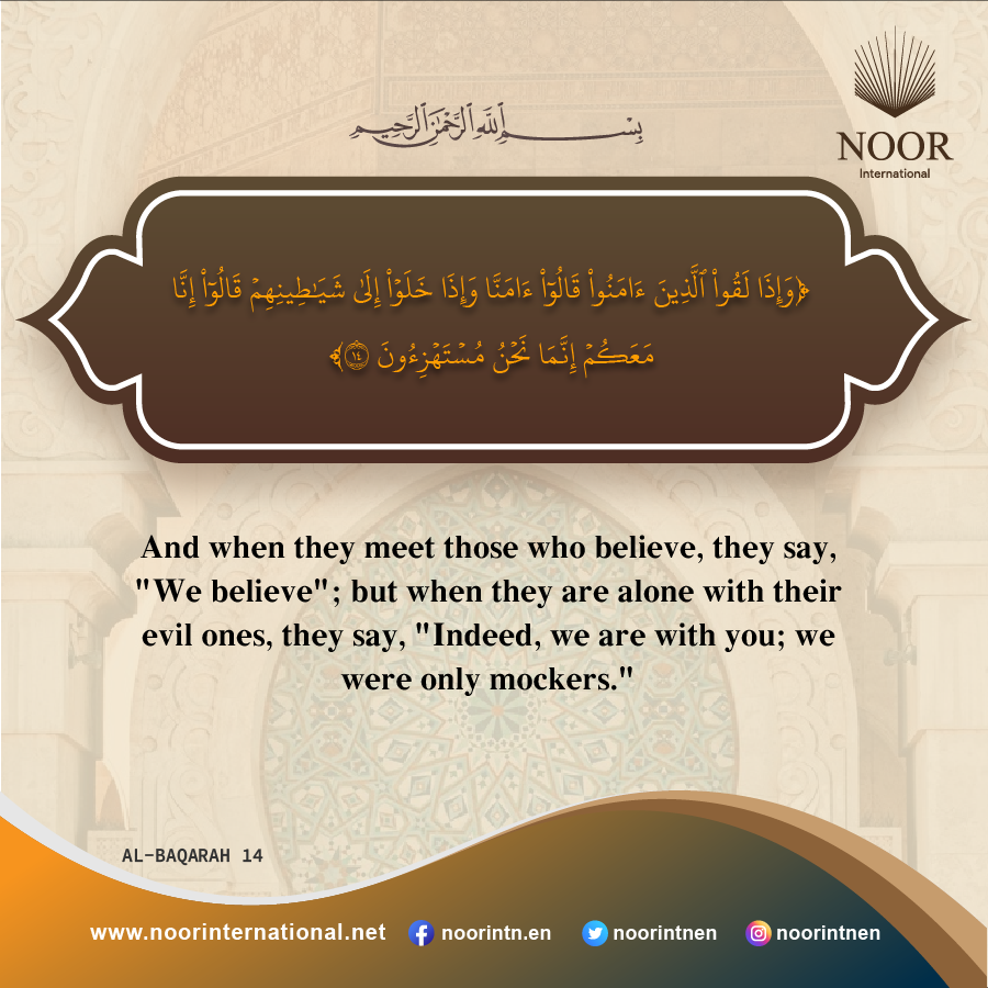 And when they meet those who believe, they say, "We believe"; but when they are alone with their evil ones, they say, "Indeed, we are with you; we were only mockers."
