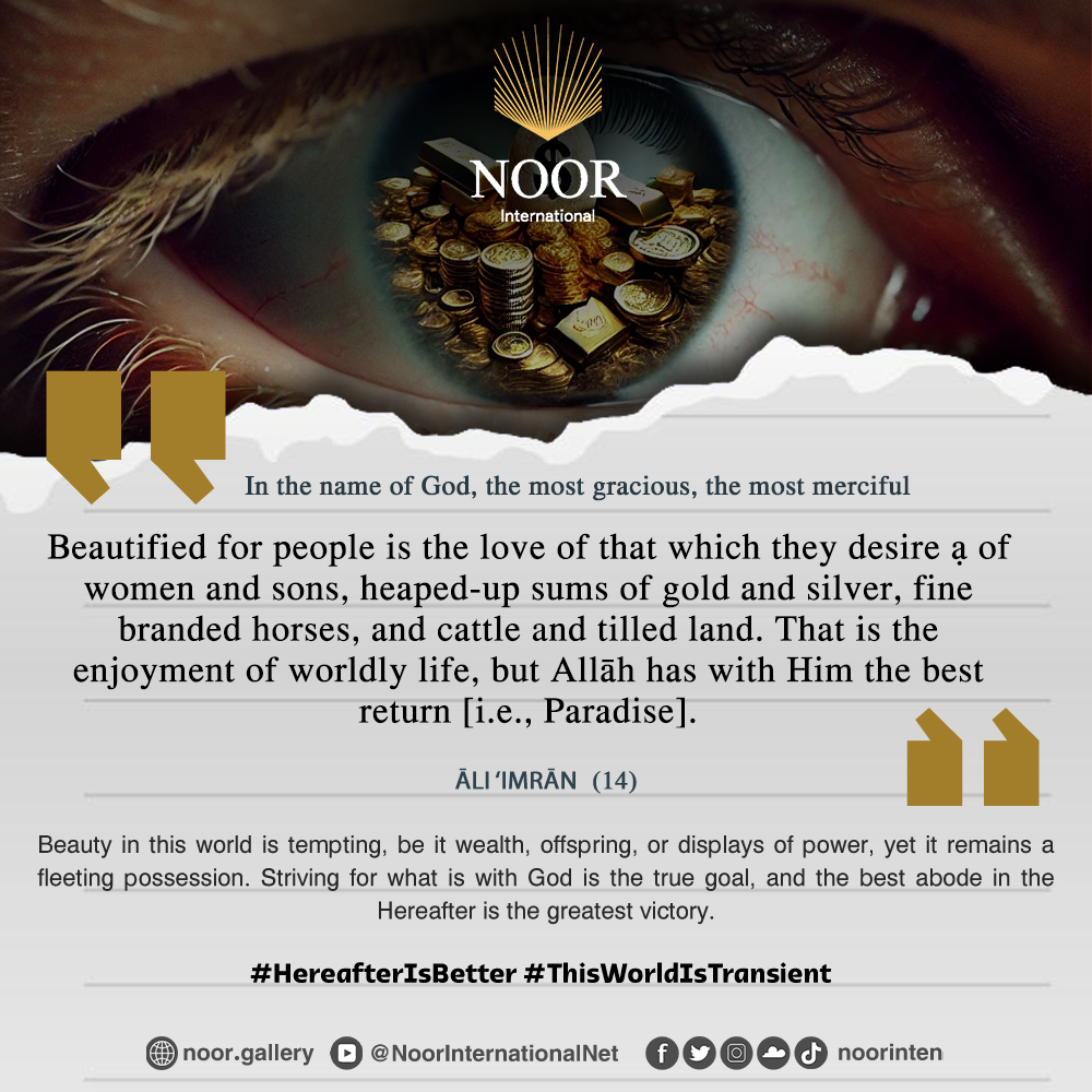 "Beauty in this world is tempting, be it wealth, offspring, or displays of power, yet it remains a fleeting possession. Striving for what is with God is the true goal, and the best abode in the Hereafter is the greatest victory." #HereafterIsBetter #ThisWorldIsTransient
