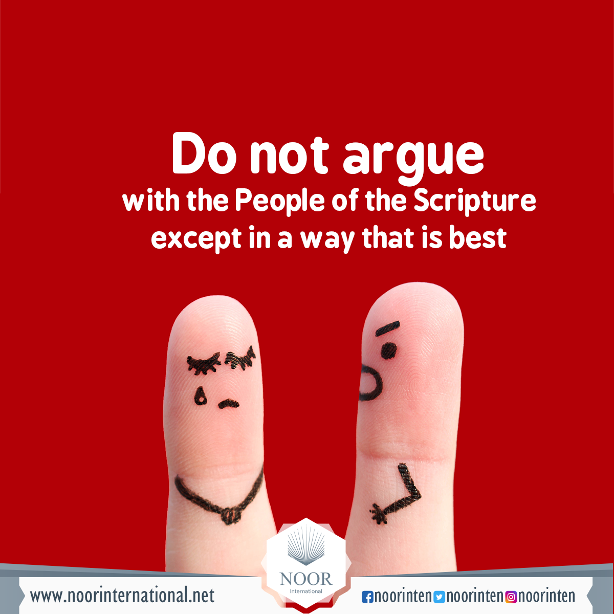 {  And do not argue with the People of the Scripture except in a way that is best, except for those who commit injustice among them, and say, "We believe in that which has been revealed to us and revealed to you. And our God and your God is one; and we are Muslims [in submission] to Him }