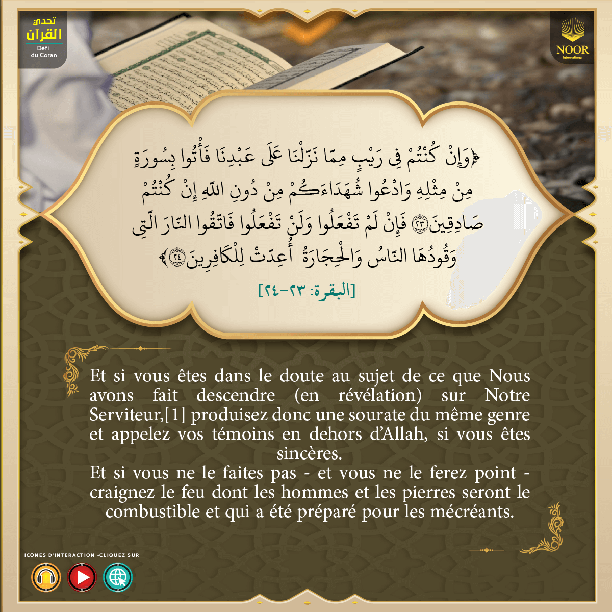 Et si vous êtes dans le doute au sujet de ce que Nous avons fait descendre (en révélation) sur Notre Serviteur,[1] produisez donc une sourate du même genre et appelez vos témoins en dehors d’Allah, si vous êtes sincères. Et si vous ne le faites pas - et vous ne le ferez point - craignez le feu dont les hommes et les pierres seront le combustible et qui a été préparé pour les mécréants.