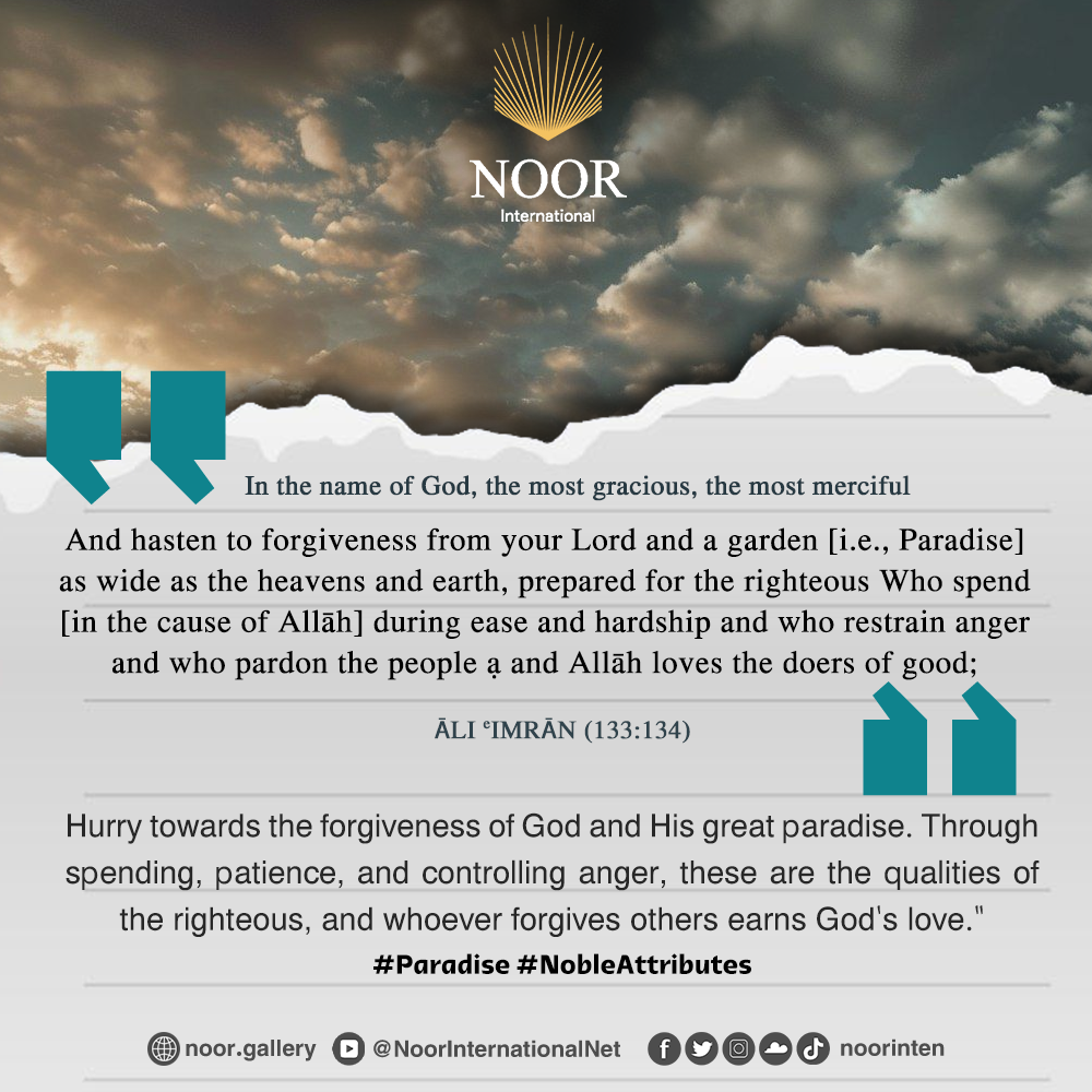 "Hurry towards the forgiveness of God and His great paradise. Through spending, patience, and controlling anger, these are the qualities of the righteous, and whoever forgives others earns God's love." #Paradise #NobleAttributes