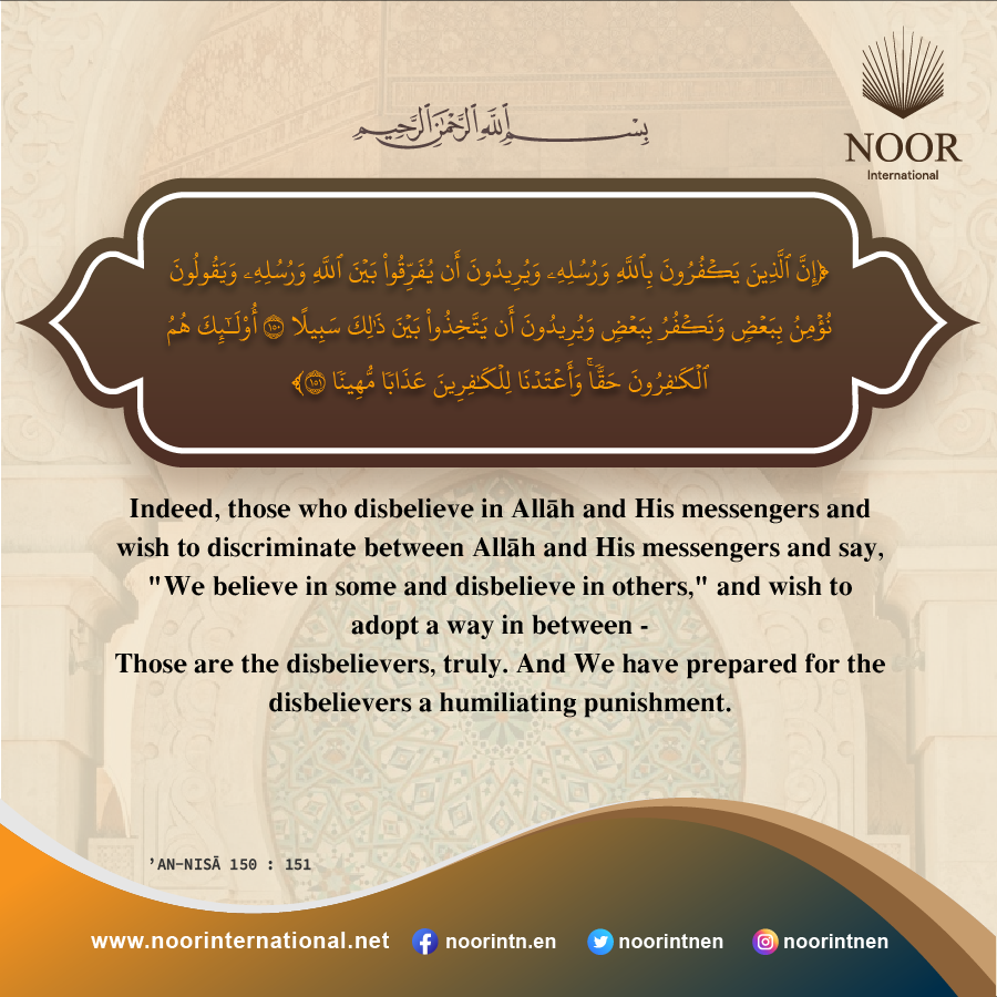 Indeed, those who disbelieve in Allah and His messengers and wish to discriminate between Allah and His messengers and say, "We believe in some and disbelieve in others," and wish to adopt a way in between –Those are the disbelievers, truly. And We have prepared for the disbelievers a humiliating punishment.