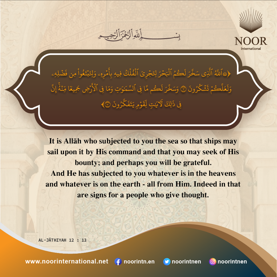 It is Allah who subjected to you the sea so that ships may sail upon it by His command and that you may seek of His bounty; and perhaps you will be grateful.