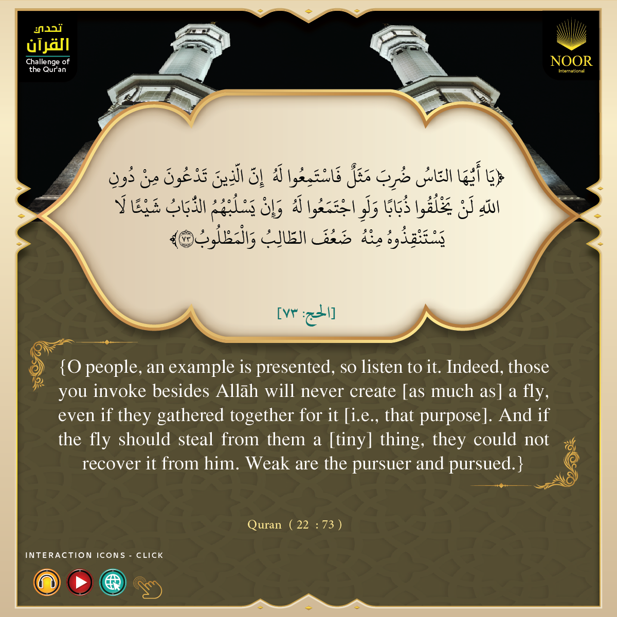 يَا أَيُّهَا النَّاسُ ضُرِبَ مَثَلٌ فَاسْتَمِعُوا لَهُ إِنَّ الَّذِينَ تَدْعُونَ مِنْ دُونِ اللَّهِ لَنْ يَخْلُقُوا ذُبَابًا وَلَوِ اجْتَمَعُوالَهُ وَإِنْ يَسْلُبْهُمُ الذُّبَابُ شَيْئًا لَا يَسْتَنْقِذُوهُ مِنْهُ ضَعُفَ الطَّالِبُ وَالْمَطْلُوبُ
