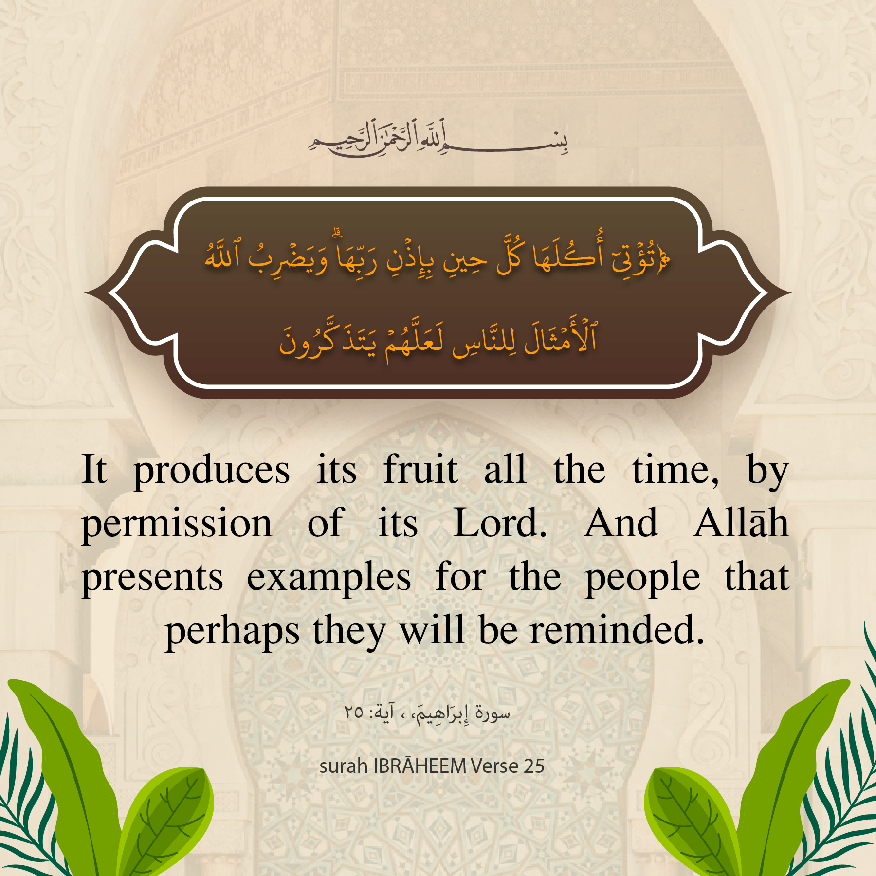 It produces its fruit all the time, by permission of its Lord. And AllŒh presents examples for the people that perhaps they will be reminded.