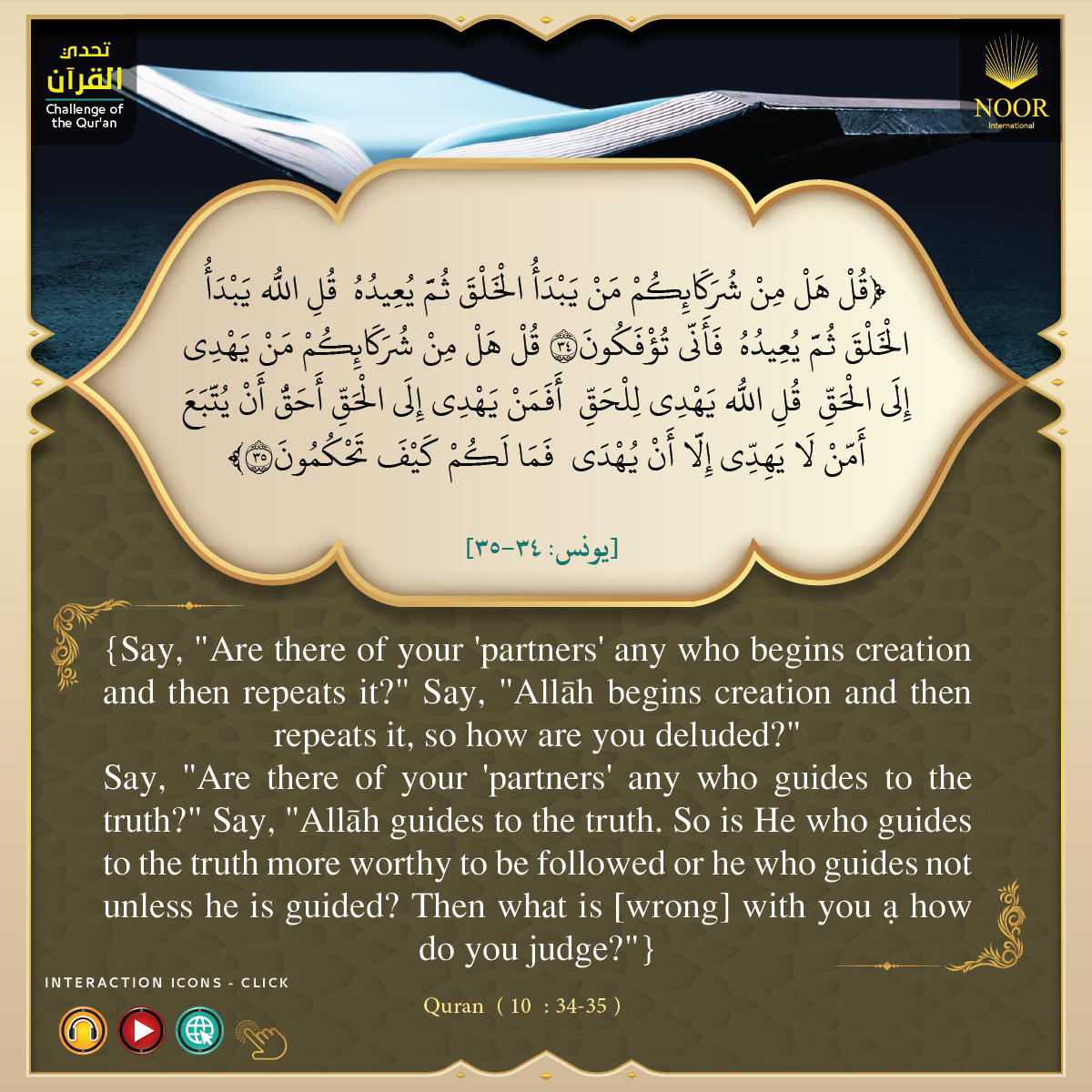 قُلۡ هَلۡ مِن شُرَكَآئِكُم مَّن يَبۡدَؤُاْ ٱلۡخَلۡقَ ثُمَّ يُعِيدُهُۥۚ قُلِ ٱللَّهُ يَبۡدَؤُاْ ٱلۡخَلۡقَ ثُمَّ يُعِيدُهُۥۖ فَأَنَّىٰ تُؤۡفَكُونَ 34 قُلۡ هَلۡ مِن شُرَكَآئِكُم مَّن يَهۡدِيٓ إِلَى ٱلۡحَقِّۚ قُلِ ٱللَّهُ يَهۡدِي لِلۡحَقِّۗ أَفَمَن يَهۡدِيٓ إِلَى ٱلۡحَقِّ أَحَقُّ أَن يُتَّبَعَ أَمَّن لَّا يَهِدِّيٓ إِلَّآ أَن يُهۡدَىٰۖ فَمَا لَكُمۡ كَيۡفَ تَحۡكُمُونَ