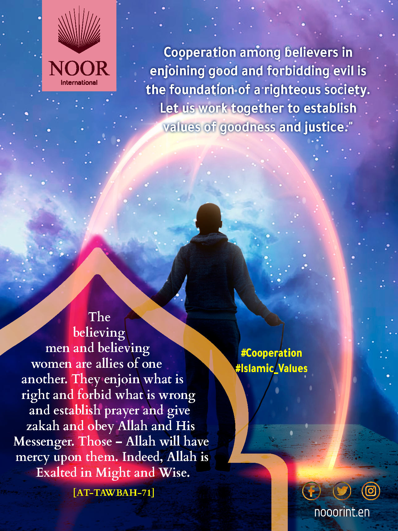 "Cooperation among believers in enjoining good and forbidding evil is the foundation of a righteous society. Let us work together to establish values of goodness and justice." #Cooperation #Islamic_Values