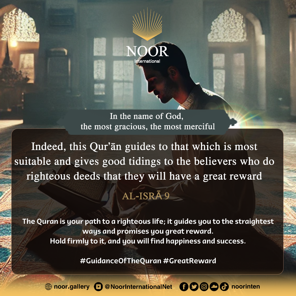The Quran is your path to a righteous life; it guides you to the straightest ways and promises you great reward. Hold firmly to it, and you will find happiness and success. #GuidanceOfTheQuran #GreatReward