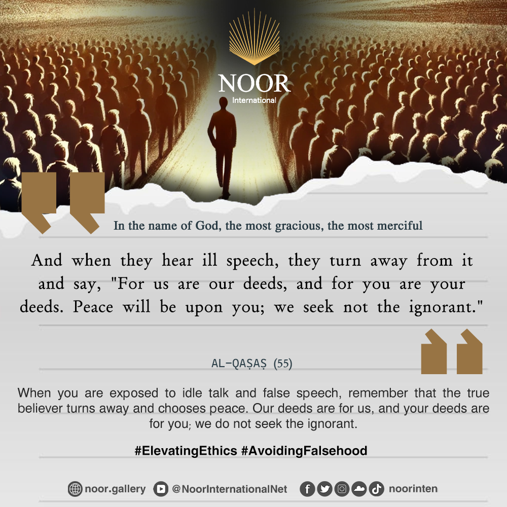 "When you are exposed to idle talk and false speech, remember that the true believer turns away and chooses peace. Our deeds are for us, and your deeds are for you; we do not seek the ignorant." #ElevatingEthics #AvoidingFalsehood