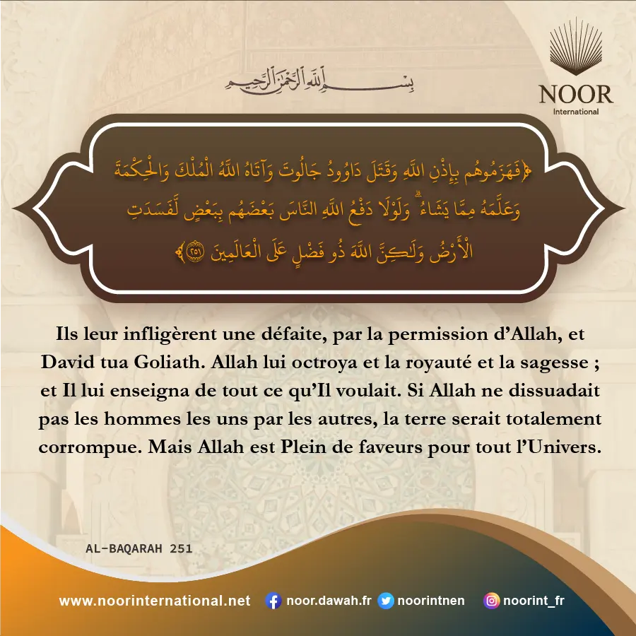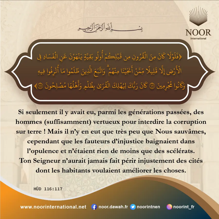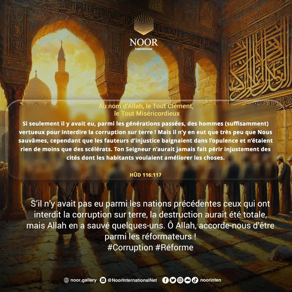 S’il n’y avait pas eu parmi les nations précédentes ceux qui ont interdit la corruption sur terre, la destruction aurait été totale, mais Allah en a sauvé quelques-uns. Ô Allah, accorde-nous d’être parmi les réformateurs !