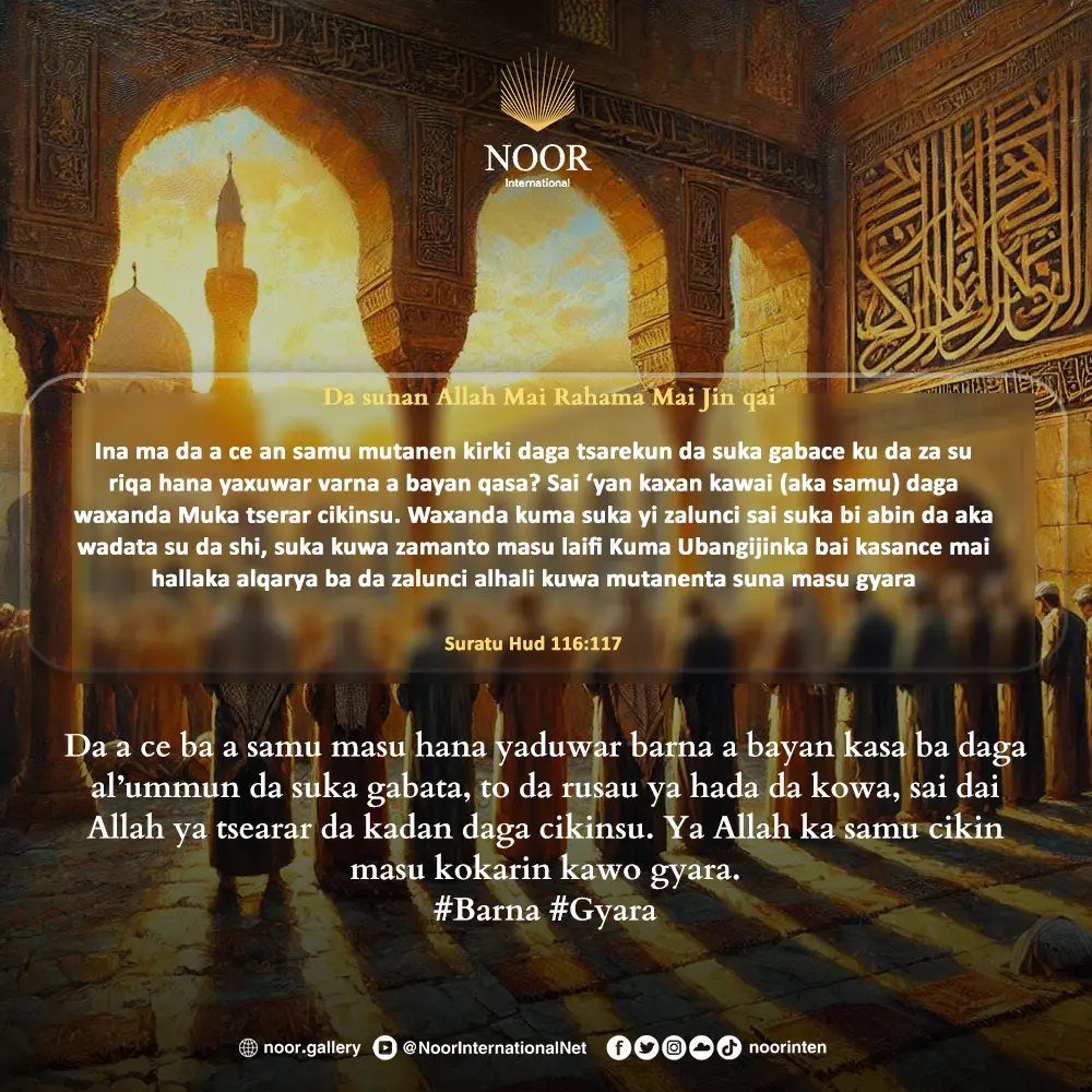 Da a ce ba a samu masu hana yaduwar barna a bayan kasa ba daga al’ummun da suka gabata, to da rusau ya hada da kowa, sai dai Allah ya tsearar da kadan daga cikinsu. Ya Allah ka samu cikin masu kokarin kawo gyara.