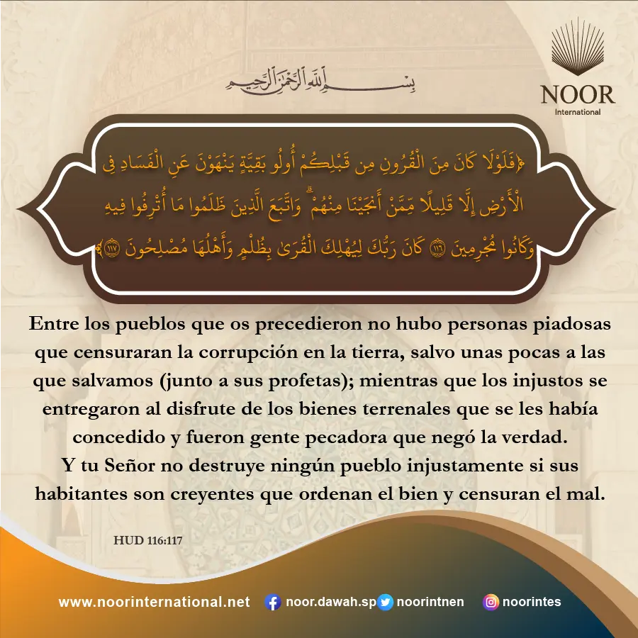 Si no hubieran existido, en las naciones anteriores, quienes prohibieran la corrupción en la tierra, la ruina se habría extendido; pero Al-lah salvó a unos pocos. ¡Oh, Al-lah, haznos de los reformadores!