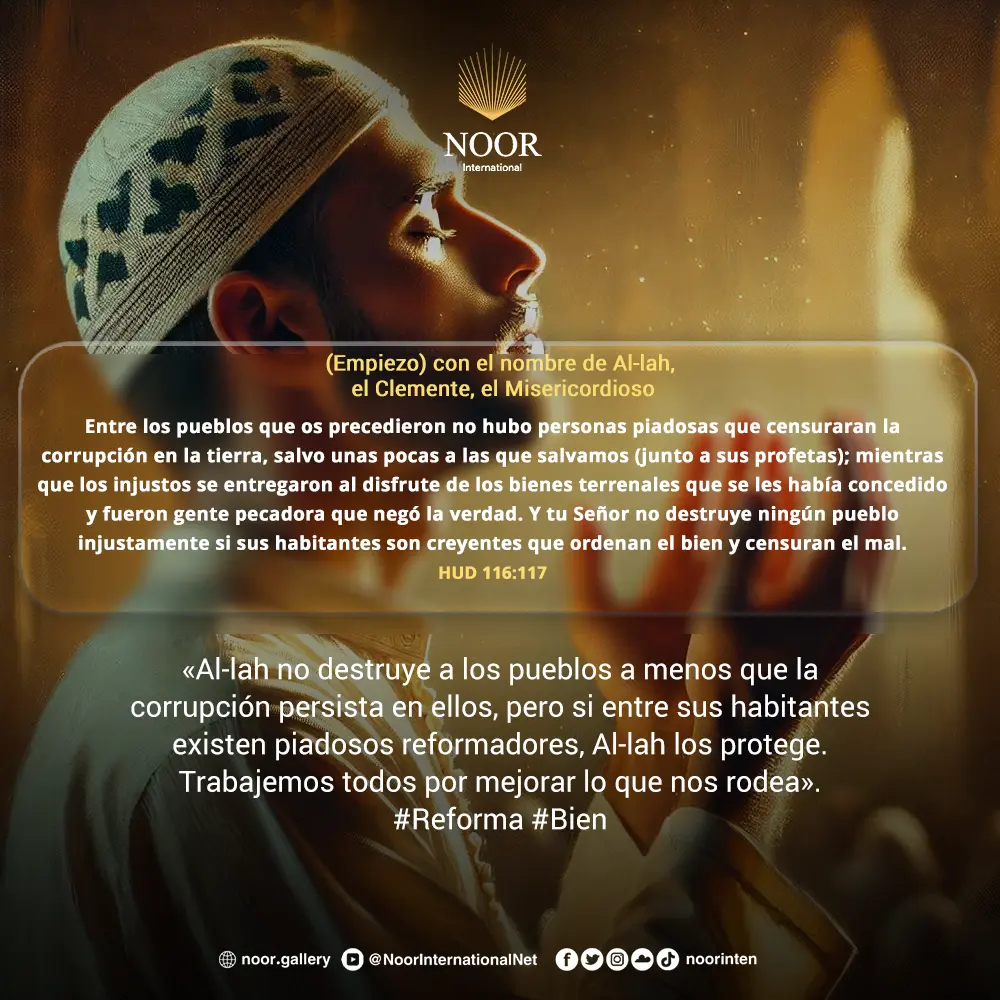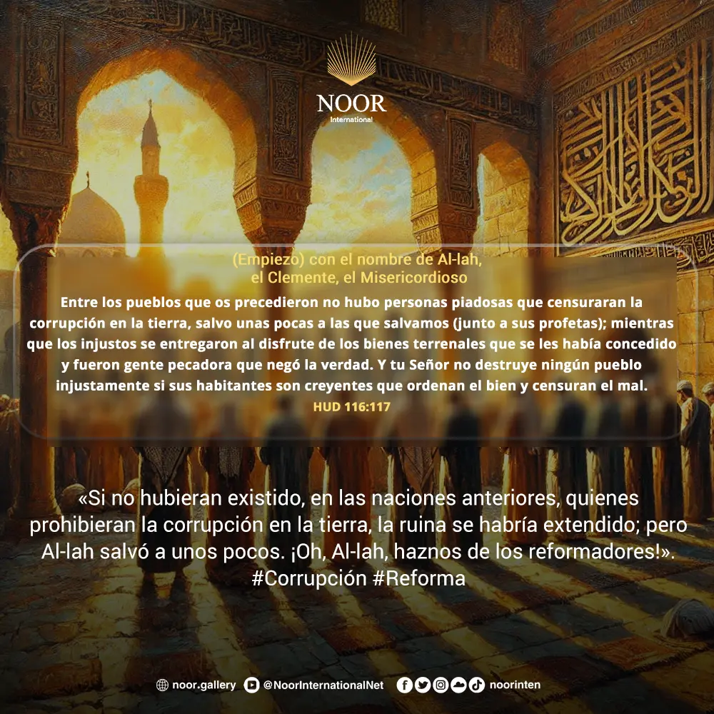«Si no hubieran existido, en las naciones anteriores, quienes prohibieran la corrupción en la tierra, la ruina se habría extendido; pero Al-lah salvó a unos pocos. ¡Oh, Al-lah, haznos de los reformadores!».