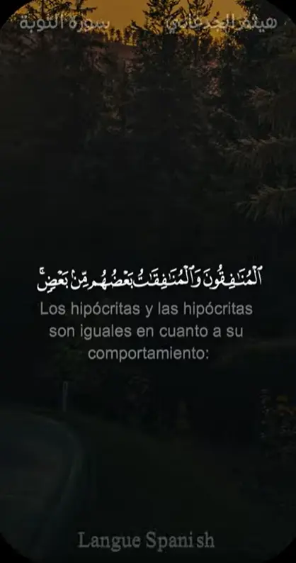 Los hipócritas y las hipócritas son iguales en cuanto a su comportamiento: ordenan el mal, prohíben el bien y no dan caridad. Han olvidado (obedecer) a Al-lah, y Al-lah los olvidará (negándoles Su misericordia). En verdad, los hipócritas son los (más) rebeldes (por desobedecer a Al-lah).