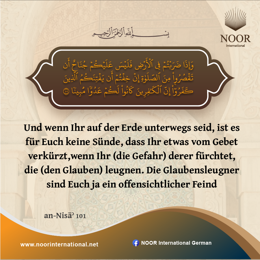 Und wenn Ihr auf der Erde unterwegs seid, ist es für Euch keine Sünde, dass Ihr etwas vom Gebet verkürzt, wenn Ihr (die Gefahr) derer fürchtet, die (den Glauben) leugnen. Die Glaubensleugner sind Euch ja ein offensichtlicher Feind