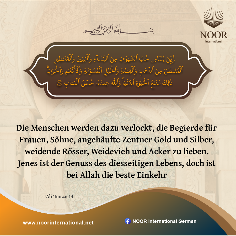 Die Menschen werden dazu verlockt, die Begierde für Frauen, Söhne, angehäufte Zentner Gold und Silber, weidende Rösser, Weidevieh und Acker zu lieben. Jenes ist der Genuss des diesseitigen Lebens, doch ist bei Allah die beste Einkehr