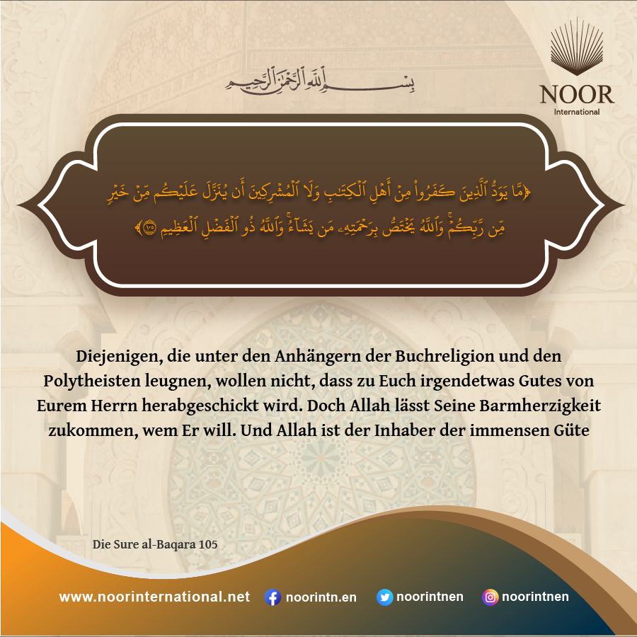 Diejenigen, die unter den Anhängern der Buchreligion und den Polytheisten leugnen, wollen nicht, dass zu Euch irgendetwas Gutes von Eurem Herrn herabgeschickt wird. Doch Allah lässt Seine Barmherzigkeit zukommen, wem Er will. Und Allah ist der Inhaber der immensen Güte
