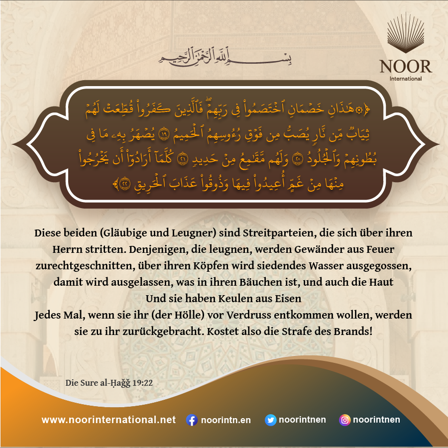 Diese beiden (Gläubige und Leugner) sind Streitparteien, die sich über[1] ihren Herrn stritten. Denjenigen, die leugnen, werden Gewänder aus Feuer zurechtgeschnitten, über ihren Köpfen wird siedendes Wasser ausgegossen,(20)damit wird ausgelassen, was in ihren Bäuchen ist, und auch die Haut(21)Und sie haben Keulen aus Eisen(22)Jedes Mal, wenn sie ihr (der Hölle) vor Verdruss entkommen wollen, werden sie zu ihr zurückgebracht. Kostet also die Strafe des Brand