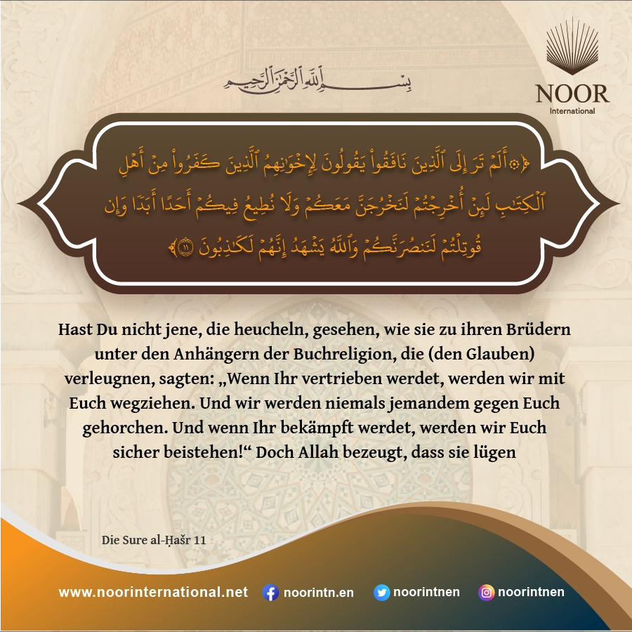 Hast Du nicht jene, die heucheln, gesehen, wie sie zu ihren Brüdern unter den Anhängern der Buchreligion, die (den Glauben) verleugnen, sagten: „Wenn Ihr vertrieben werdet, werden wir mit Euch wegziehen. Und wir werden niemals jemandem gegen Euch gehorchen. Und wenn Ihr bekämpft werdet, werden wir Euch sicher beistehen!“ Doch Allah bezeugt, dass sie lügen