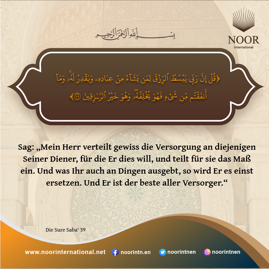 Sag: „Mein Herr verteilt gewiss die Versorgung an diejenigen Seiner Diener, für die Er dies will, und teilt für sie das Maß ein. Und was Ihr auch an Dingen ausgebt, so wird Er es einst ersetzen. Und Er ist der beste aller Versorger.“