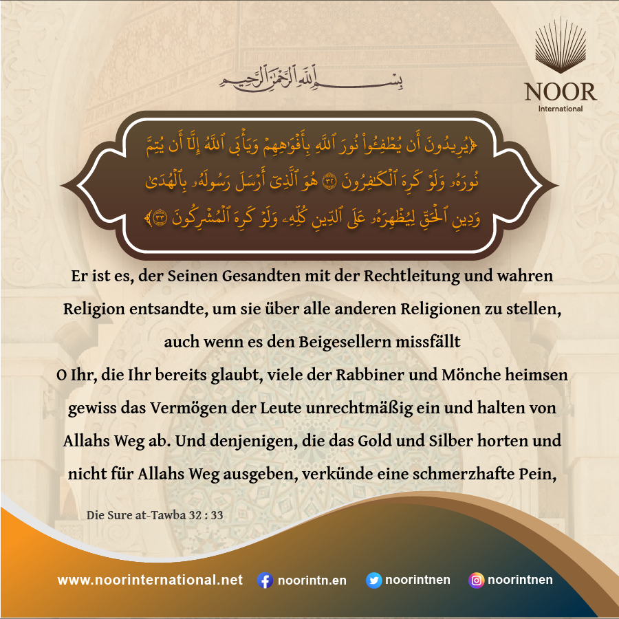 Sie wollen Allahs Licht mit ihren Mündern (Lügen über Allah) auslöschen, doch will Allah allein, dass Sein Licht stets leuchtet, auch wenn es den Glaubensleugnern missfällt(33)Er ist es, der Seinen Gesandten mit der Rechtleitung und wahren Religion entsandte, um sie über alle anderen Religionen zu stellen, auch wenn es den Beigesellern. missfällt