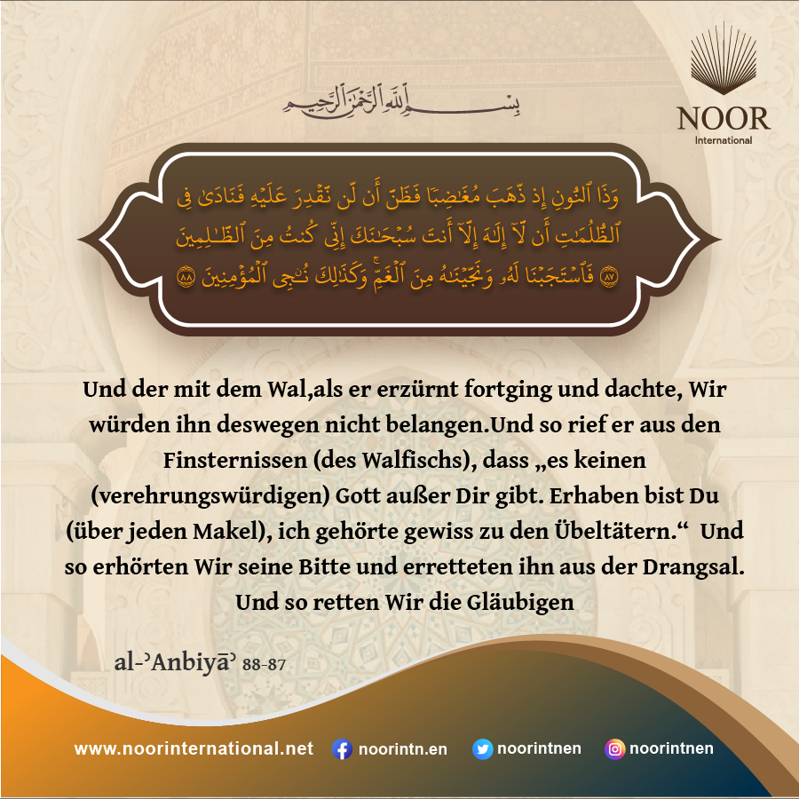 Und der mit dem Wal, als er erzürnt fortging und dachte, Wir würden ihn deswegen nicht belangen. Und so rief er aus den Finsternissen (des Walfischs), dass „es keinen (verehrungswürdigen) Gott außer Dir gibt. Erhaben bist Du (über jeden Makel), ich gehörte gewiss zu den Übeltätern.“Und so erhörten Wir seine Bitte und erretteten ihn aus der Drangsal. Und so retten Wir die Gläubigen