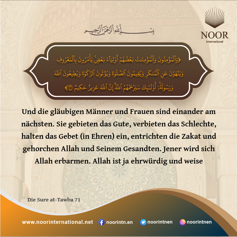 Und die gläubigen Männer und Frauen sind einander am nächsten. Sie gebieten das Gute, verbieten das Schlechte, halten das Gebet (in Ehren) ein, entrichten die Zakat und gehorchen Allah und Seinem Gesandten.