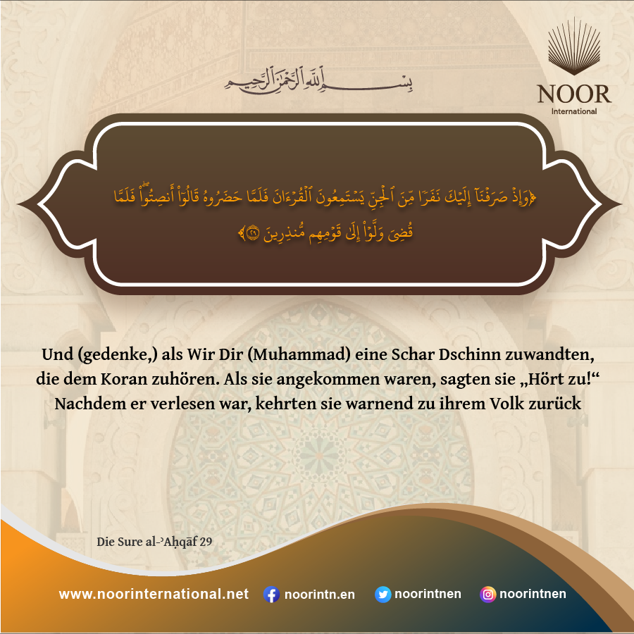 Und (gedenke,) als Wir Dir (Muhammad) eine Schar Dschinn zuwandten, die dem Koran zuhören.[1] Als sie angekommen waren, sagten sie „Hört zu!“ Nachdem er verlesen war, kehrten sie warnend zu ihrem Volk zurück