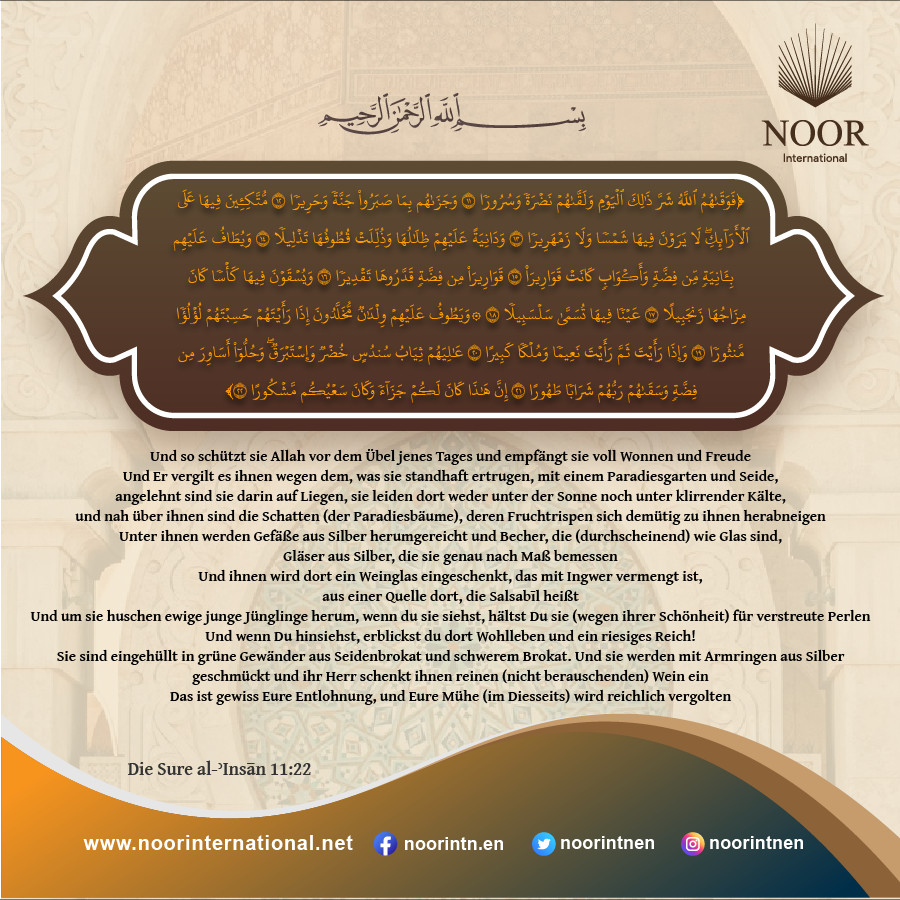 Und so schützt sie Allah vor dem Übel jenes Tages und empfängt sie voll Wonnen und Freude(12)Und Er vergilt es ihnen wegen dem, was sie standhaft ertrugen, mit einem Paradiesgarten und Seide,(13)angelehnt sind sie darin auf Liegen, sie leiden dort weder unter der Sonne noch unter klirrender Kälte,(14)und nah über ihnen sind die Schatten (der Paradiesbäume), deren Fruchtrispen sich demütig zu ihnen herabneigen(15)Unter ihnen werden Gefäße aus Silber herumgereicht und Becher, die (durchscheinend) wie Glas sind,