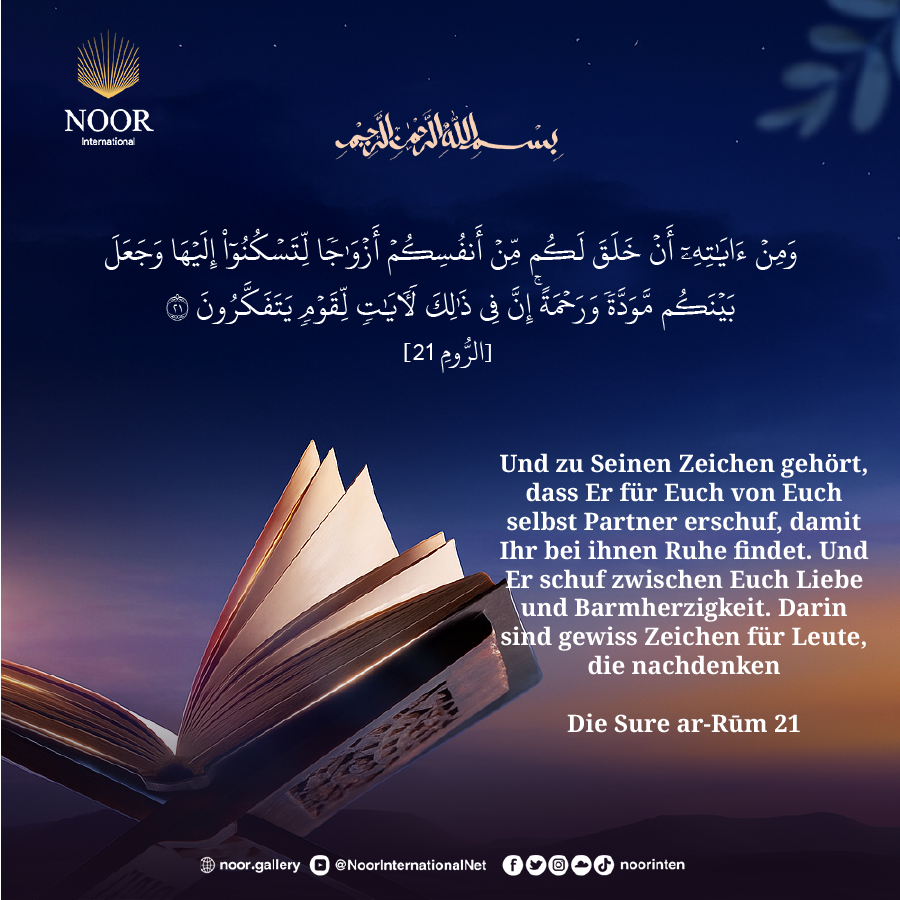 Und zu Seinen Zeichen gehört, dass Er für Euch von Euch selbst Partner erschuf, damit Ihr bei ihnen Ruhe findet. Und Er schuf zwischen Euch Liebe und Barmherzigkeit. Darin sind gewiss Zeichen für Leute, die nachdenken
