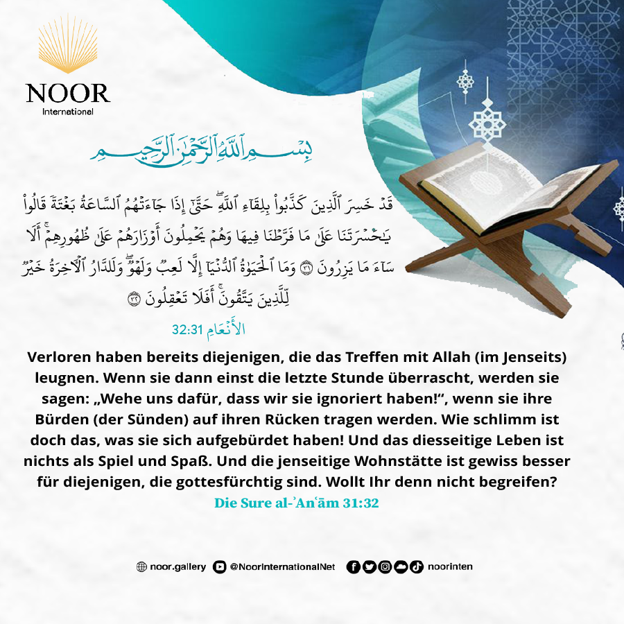 Verloren haben bereits diejenigen, die das Treffen mit Allah (im Jenseits) leugnen. Wenn sie dann einst die letzte Stunde überrascht, werden sie sagen: „Wehe uns dafür, dass wir sie ignoriert haben!“, wenn sie ihre Bürden (der Sünden) auf ihren Rücken tragen werden. Wie schlimm ist doch das, was sie sich aufgebürdet haben!