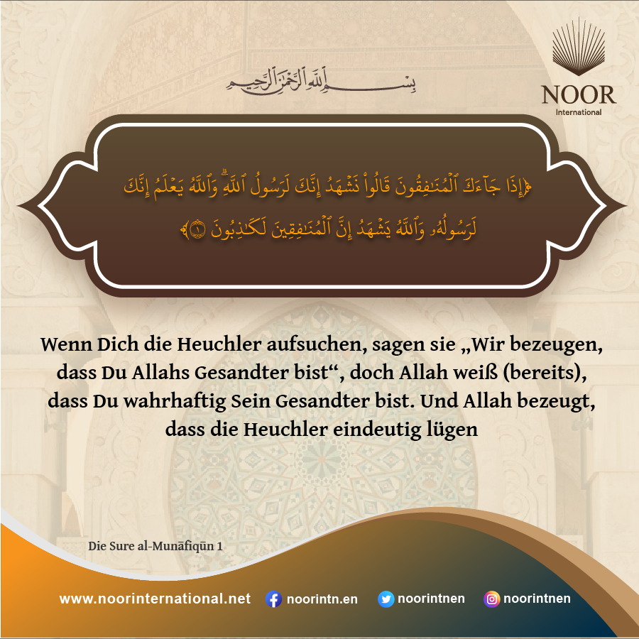 Wenn Dich die Heuchler aufsuchen, sagen sie „Wir bezeugen, dass Du Allahs Gesandter bist“, doch Allah weiß (bereits), dass Du wahrhaftig Sein Gesandter bist. Und Allah bezeugt, dass die Heuchler eindeutig lügen