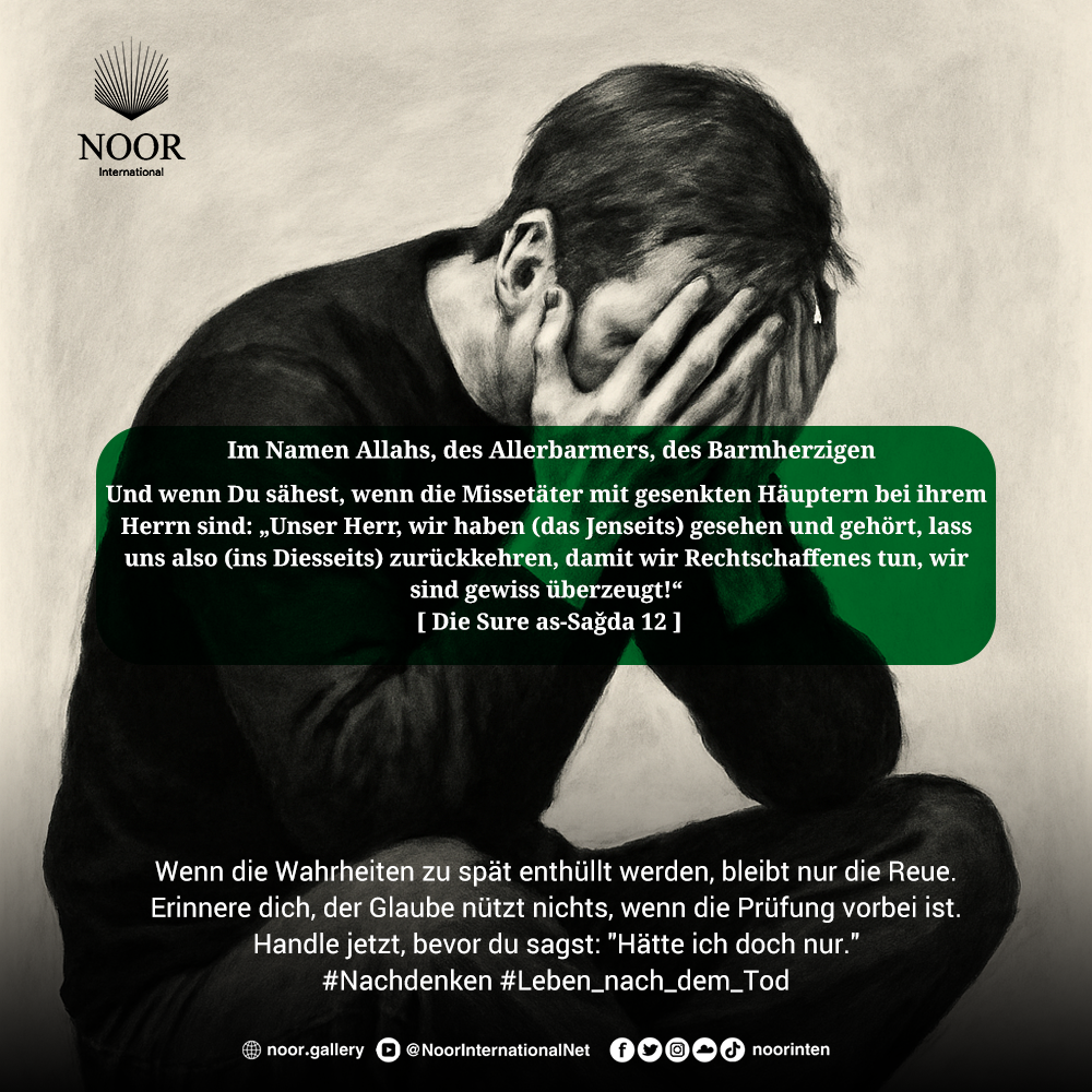 Wenn die Wahrheiten zu spät enthüllt werden, bleibt nur die Reue. Erinnere dich, der Glaube nützt nichts, wenn die Prüfung vorbei ist. Handle jetzt, bevor du sagst: "Hätte ich doch nur." #Nachdenken #Leben_nach_dem_Tod