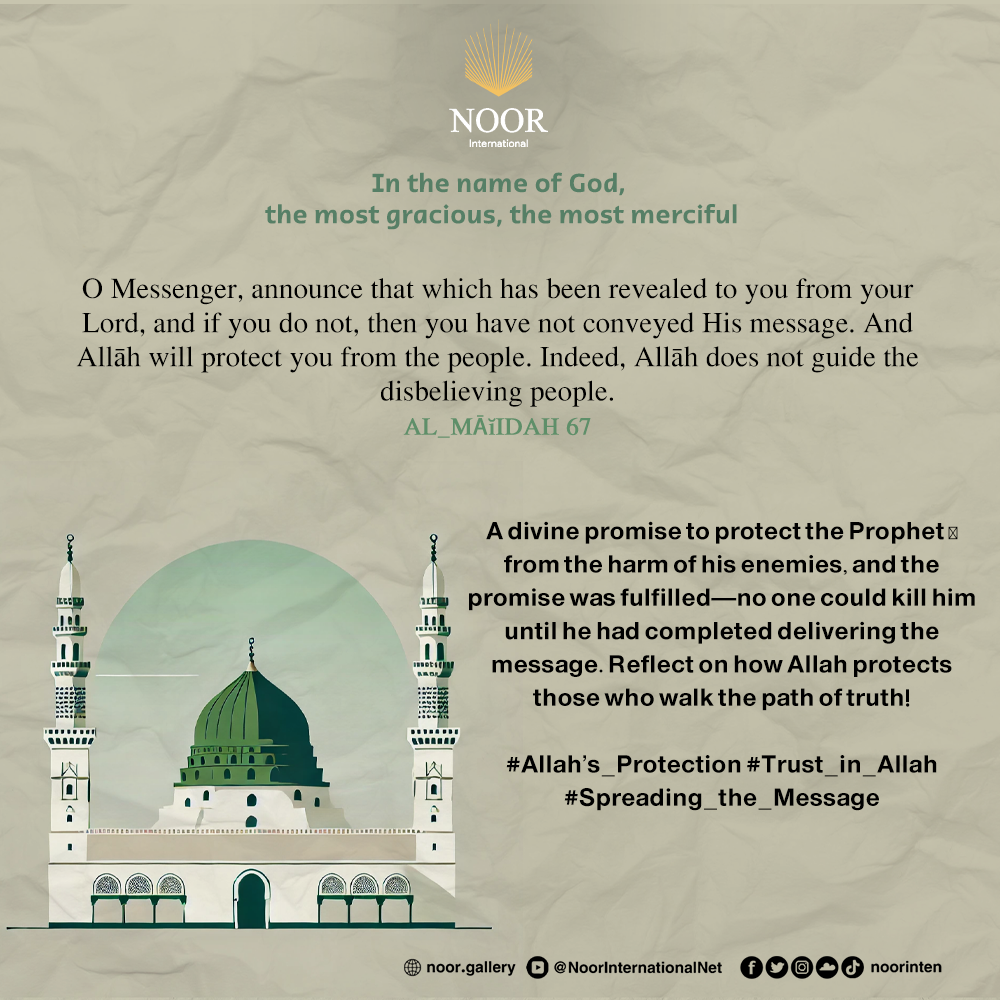 A divine promise to protect the Prophet ﷺ from the harm of his enemies, and the promise was fulfilled—no one could kill him until he had completed delivering the message. Reflect on how Allah protects those who walk the path of truth! #Allah’s_Protection #Trust_in_Allah #Spreading_the_Message
