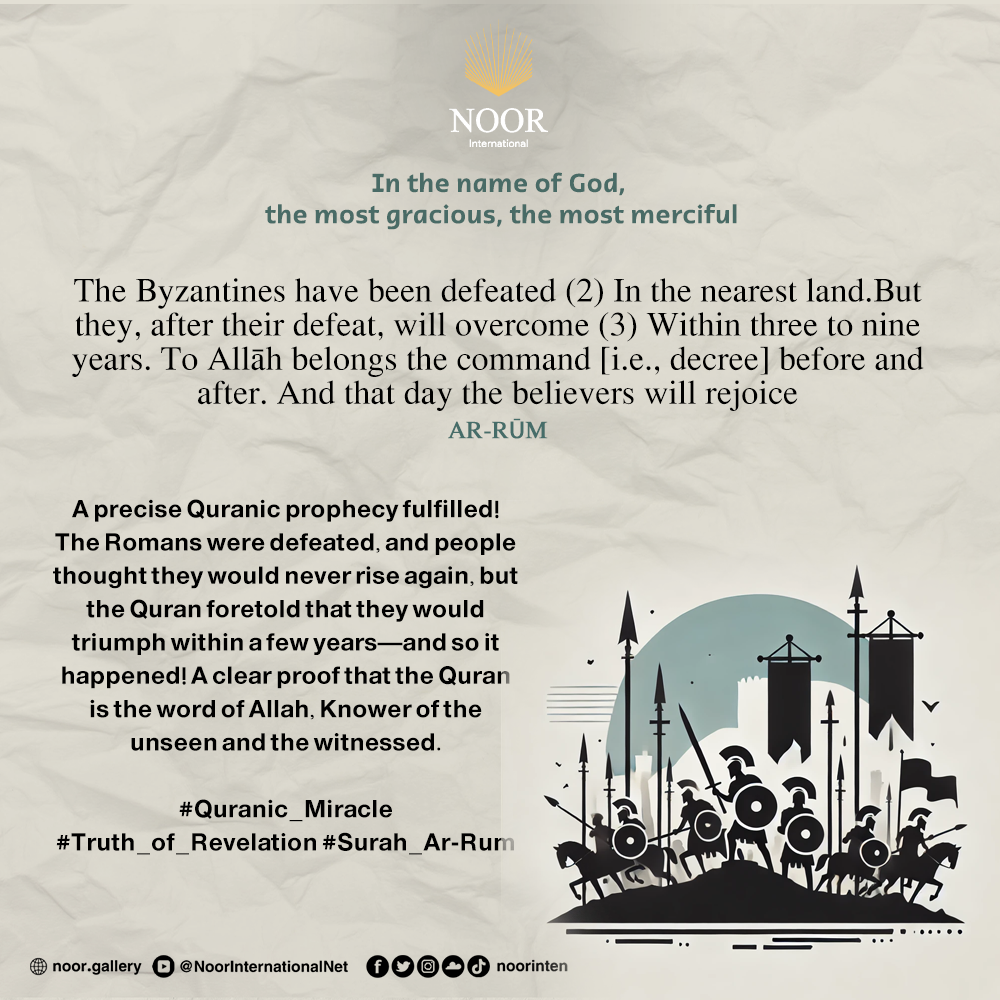 A precise Quranic prophecy fulfilled! The Romans were defeated, and people thought they would never rise again, but the Quran foretold that they would triumph within a few years—and so it happened! A clear proof that the Quran is the word of Allah, Knower of the unseen and the witnessed. #Quranic_Miracle #Truth_of_Revelation #Surah_Ar-Rum