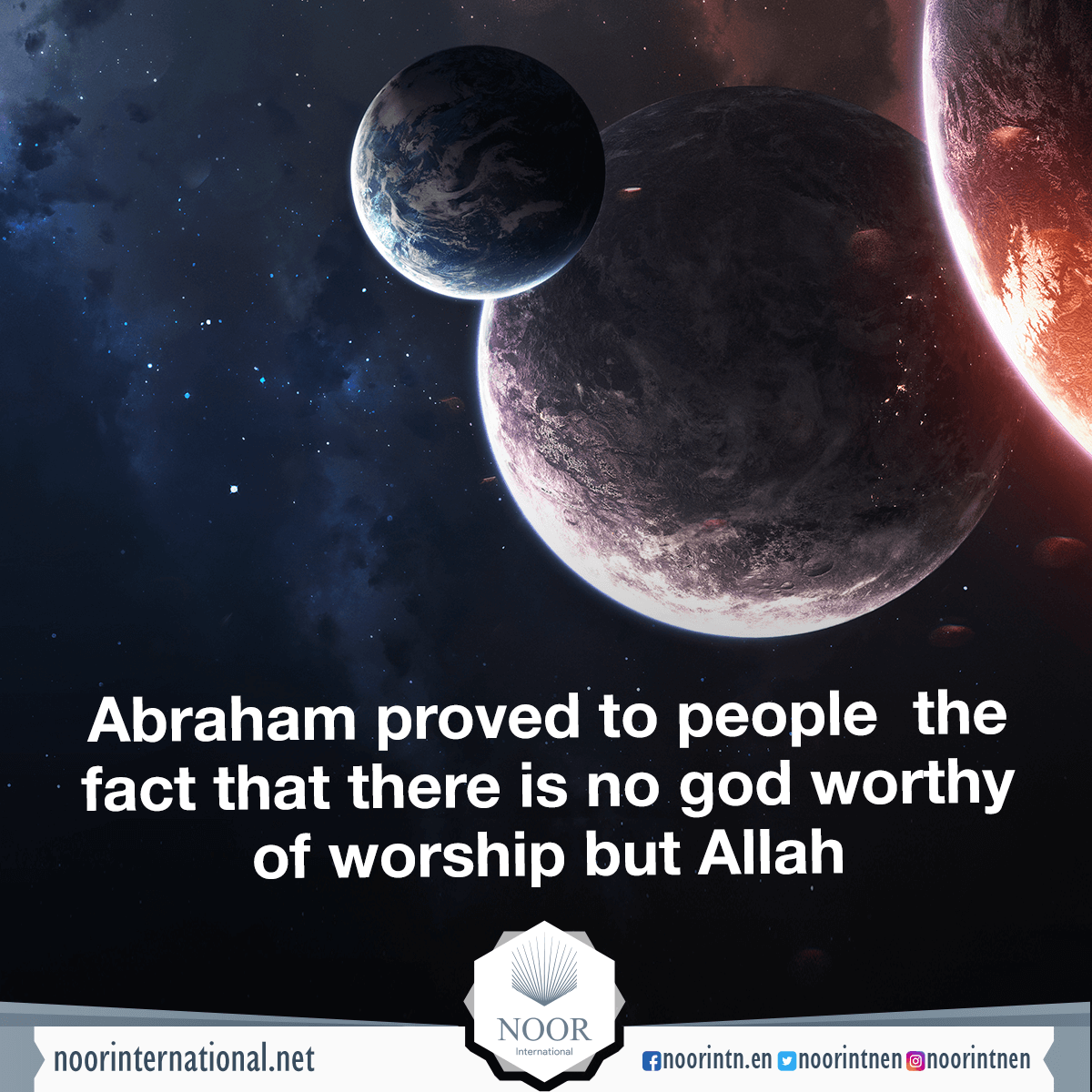 Allah said ( interpretation of the meaning ) : { And thus did We show Abraham the realm of the heavens and the earth that he would be among the certain [in faith]. So when the night covered him [with darkness], he saw a star. He said, "This is my lord."1 But when it set, he said, "I like not those that set [i.e., disappear]." And when he saw the moon rising, he said, "This is my lord." But when it set, he said, "Unless my Lord guides me, I will surely be among the people gone astray." And when he saw the sun rising, he said, "This is my lord; this is greater." But when it set, he said, "O my people, indeed I am free from what you associate with Allah. Indeed, I have turned my face [i.e., self] toward He who created the heavens and the earth, inclining toward truth, and I am not of those who associate others with Allah." } Quran ( 6 : 75 - 79 )