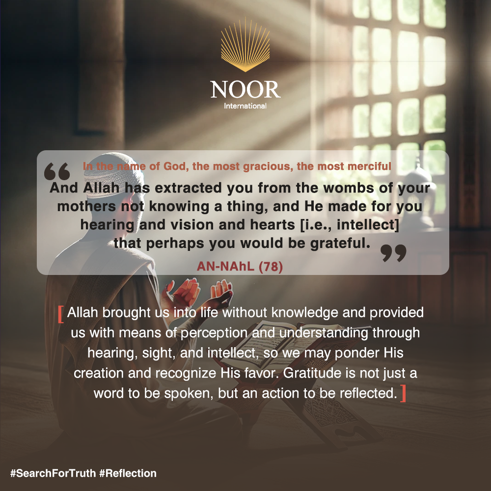 Allah brought us into life without knowledge and provided us with means of perception and understanding through hearing, sight, and intellect, so we may ponder His creation and recognize His favor. Gratitude is not just a word to be spoken, but an action to be reflected. #ThankingBlessings #Contemplation #Favor