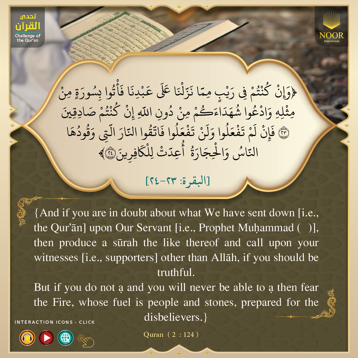 وَإِن كُنتُمۡ فِي رَيۡبٖ مِّمَّا نَزَّلۡنَا عَلَىٰ عَبۡدِنَا فَأۡتُواْ بِسُورَةٖ مِّن مِّثۡلِهِۦ وَٱدۡعُواْ شُهَدَآءَكُم مِّن دُونِ ٱللَّهِ إِن كُنتُمۡ صَٰدِقِينَ 23 فَإِن لَّمۡ تَفۡعَلُواْ وَلَن تَفۡعَلُواْ فَٱتَّقُواْ ٱلنَّارَ ٱلَّتِي وَقُودُهَا ٱلنَّاسُ وَٱلۡحِجَارَةُۖ أُعِدَّتۡ لِلۡكَٰفِرِينَ