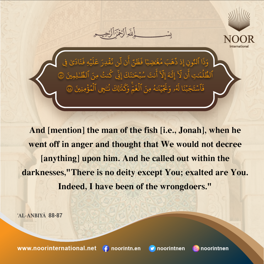 And [mention] the man of the fish [i.e., Jonah], when he went off in anger and thought that We would not decree [anything] upon him. And he called out within the darknesses, "There is no deity except You; exalted are You. Indeed, I have been of the wrongdoers."So We responded to him and saved him from the distress. And thus do We save the believers.