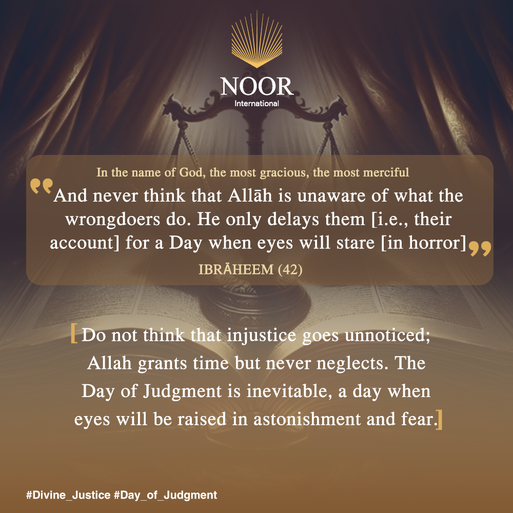 - Do not think that injustice goes unnoticed; Allah grants time but never neglects. The Day of Judgment is inevitable, a day when eyes will be raised in astonishment and fear. #Divine_Justice #Day_of_Judgment