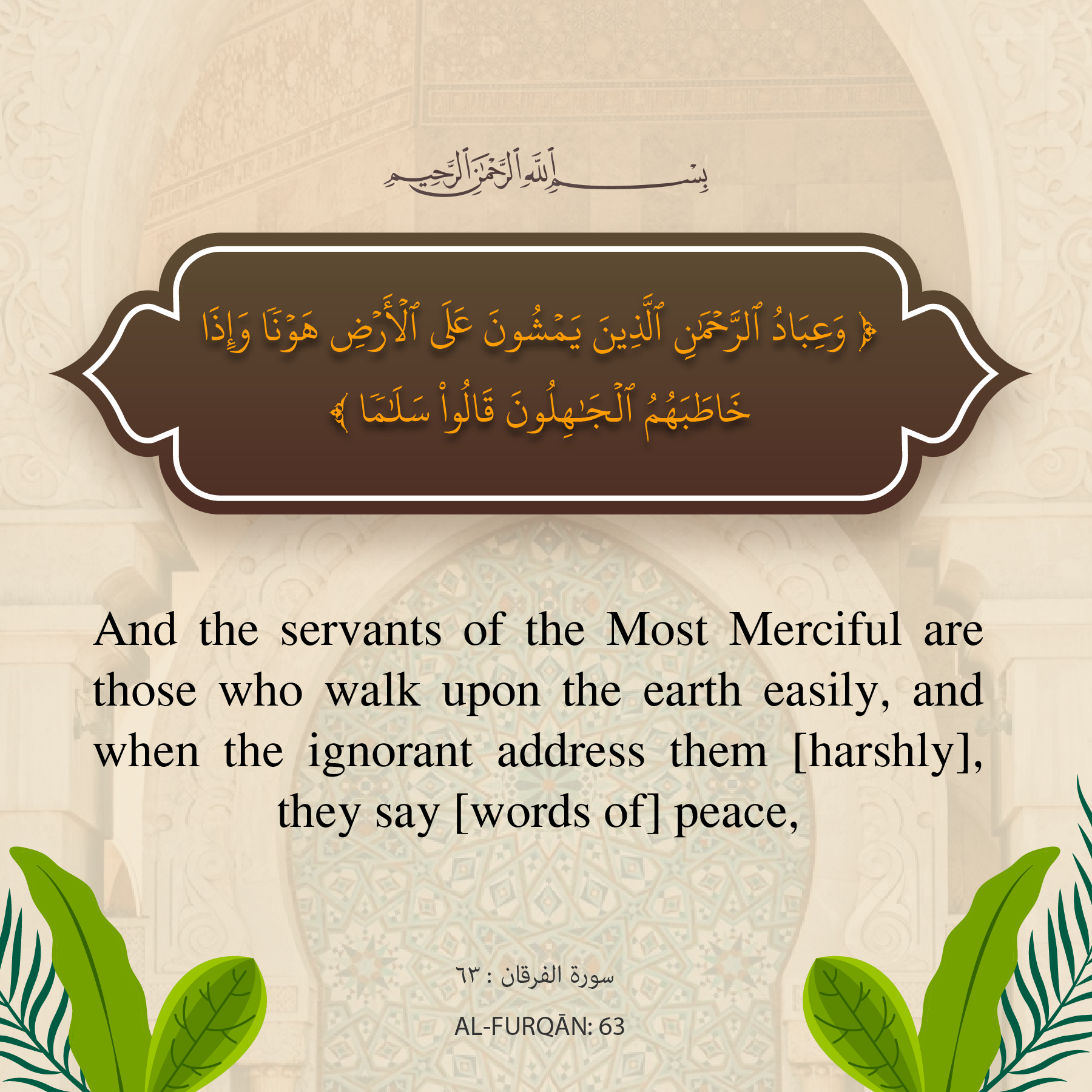 And the servants of the Most Merciful are those who walk upon the earth easily,[1] and when the ignorant address them [harshly], they say [words of] peace,