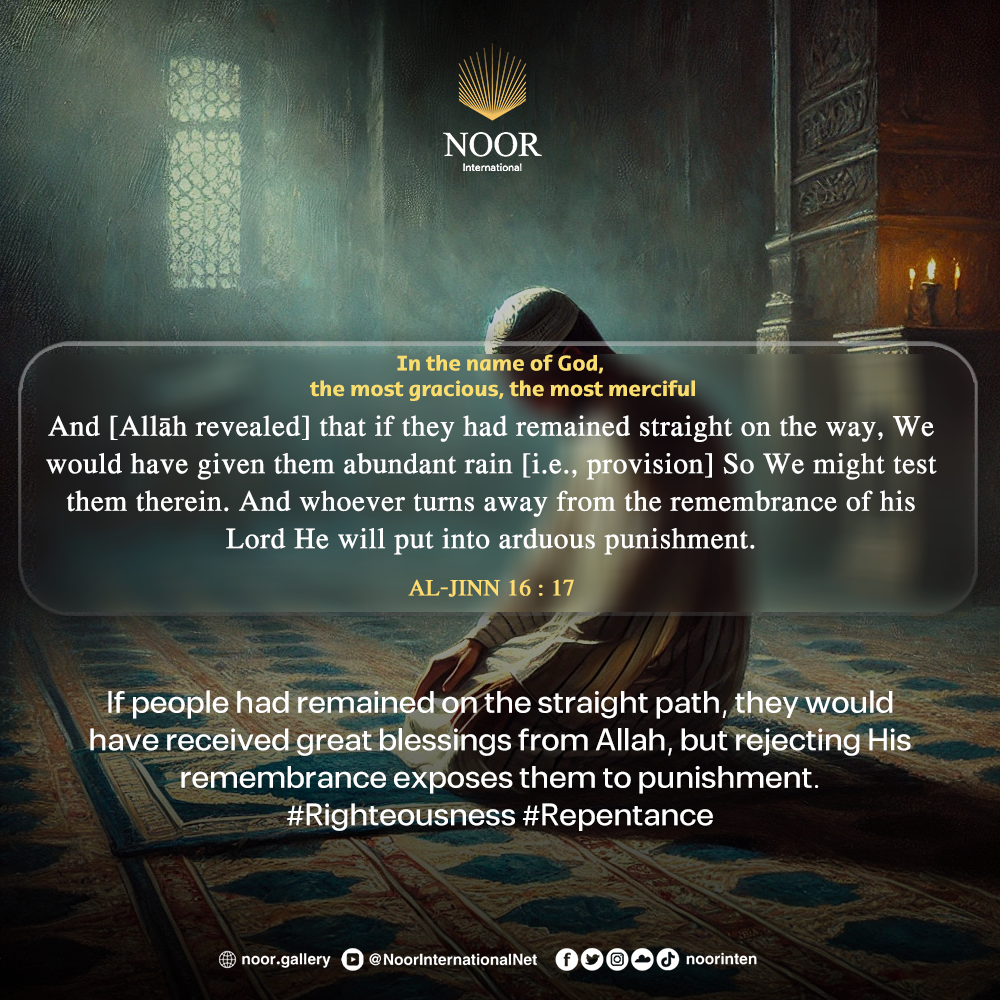 "If people had remained on the straight path, they would have received great blessings from Allah, but rejecting His remembrance exposes them to punishment.