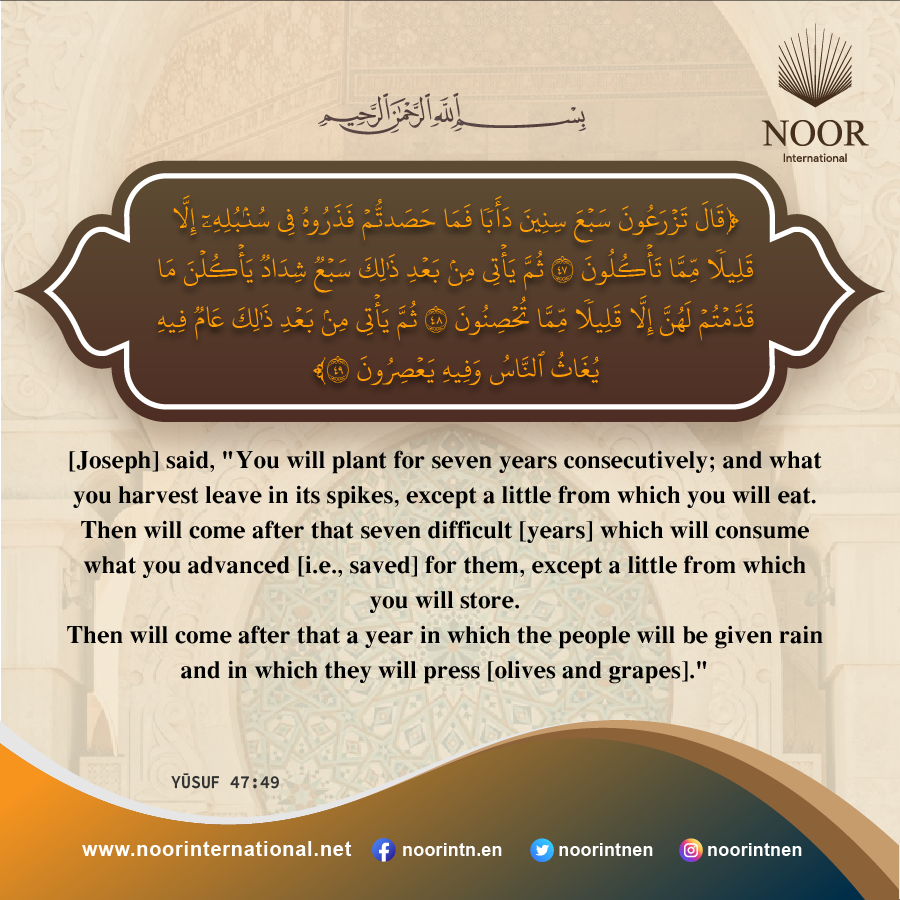 [Joseph] said, "You will plant for seven years consecutively; and what you harvest leave in its spikes, except a little from which you will eat.