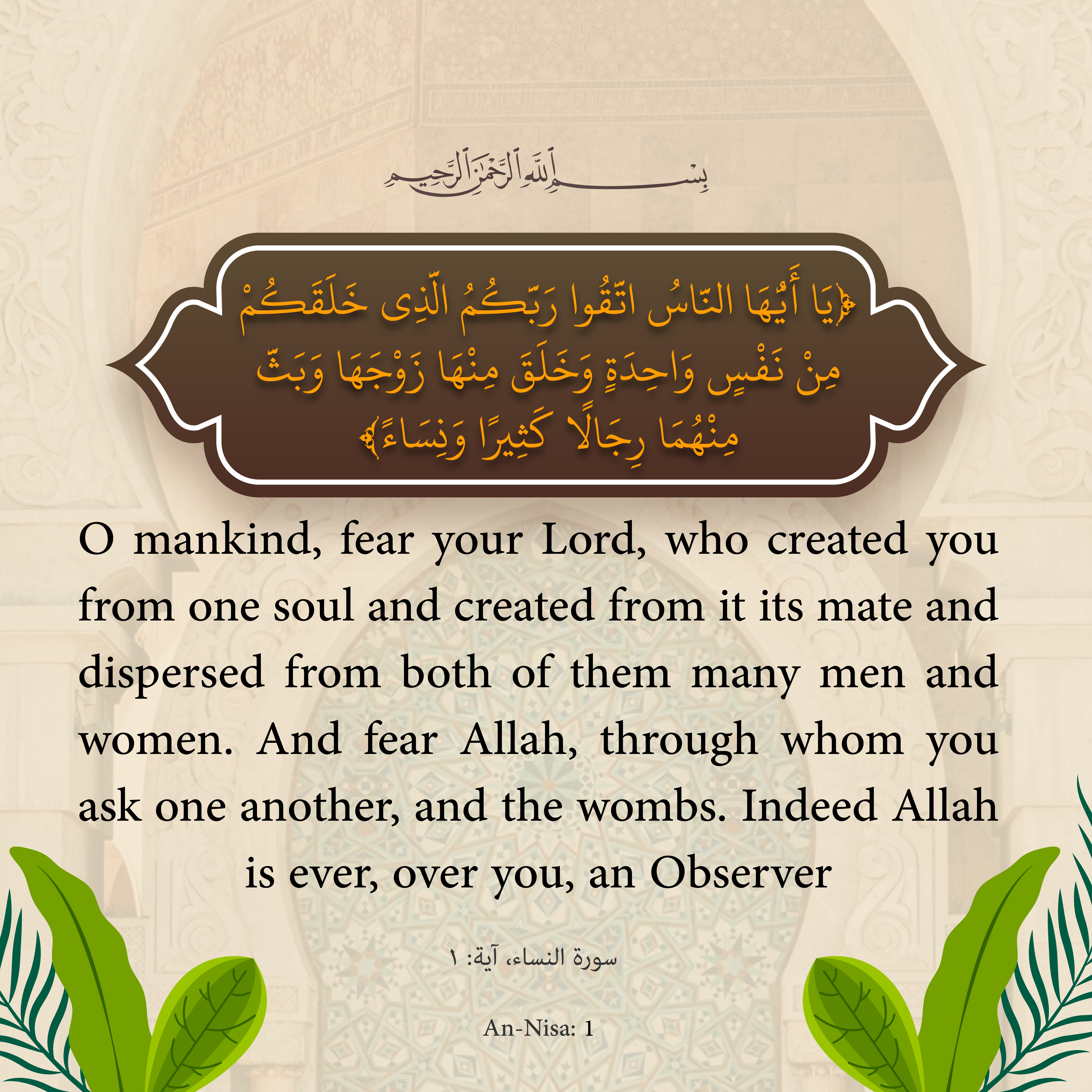O mankind, fear your Lord, who created you from one soul and created from it its mate and dispersed from both of them many men and women. And fear AllŒh, through whom[1] you ask one another,[2] and the wombs.[3] Indeed AllŒh is ever,[4] over you, an Observer.[5]