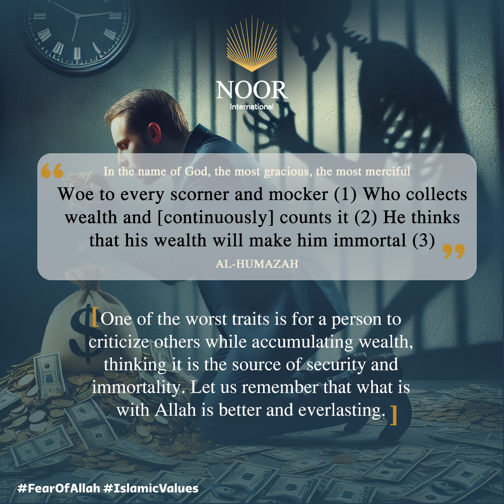 "One of the worst traits is for a person to criticize others while accumulating wealth, thinking it is the source of security and immortality. Let us remember that what is with Allah is better and everlasting."