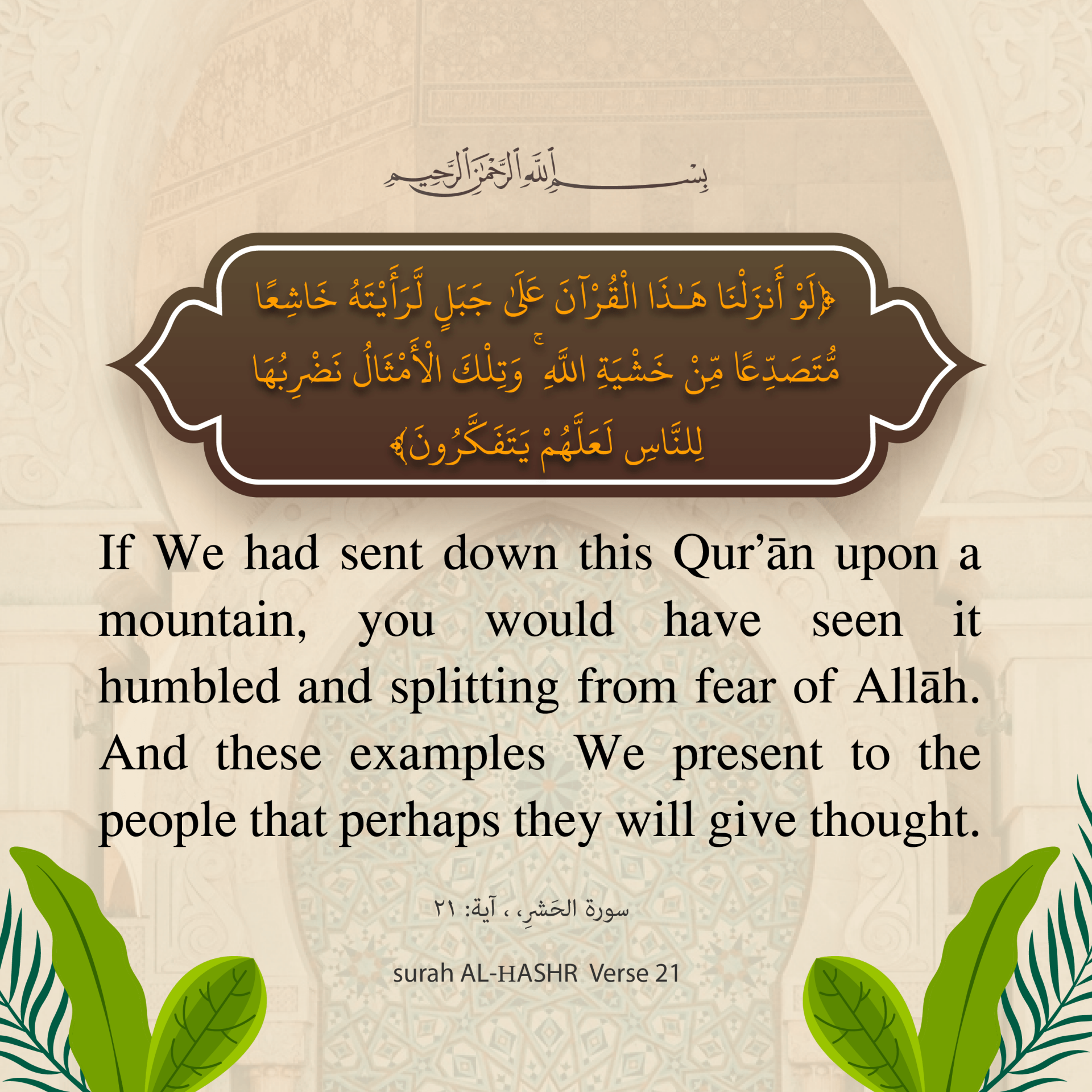 If We had sent down this Quran upon a mountain, you would have seen it humbled and splitting from fear of AllŒh. And these examples We present to the people that perhaps they will give thought.