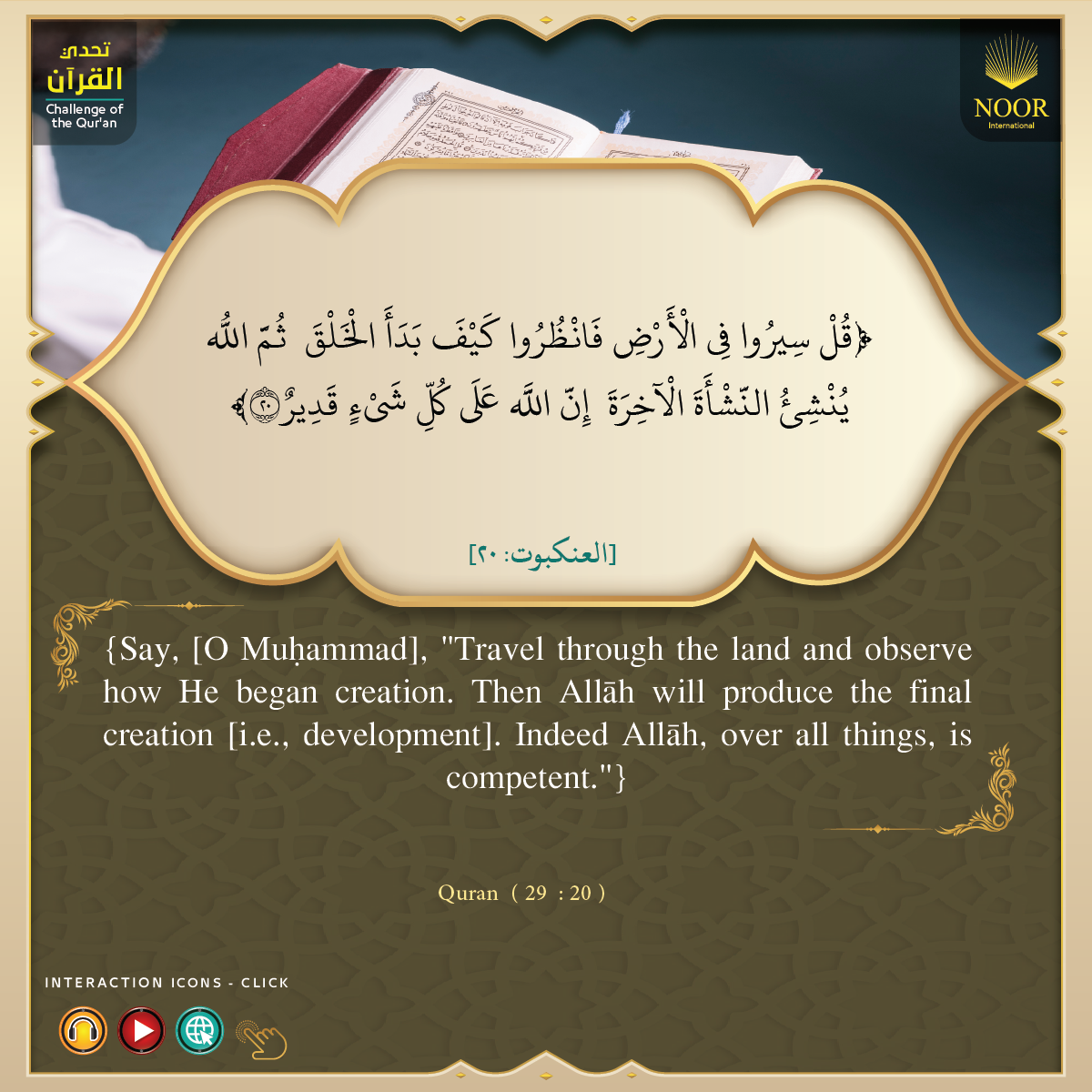 قُلْ سِيرُوا فِي الْأَرْضِ فَانْظُرُوا كَيْفَ بَدَأَ الْخَلْقَ ثُمَّ اللَّهُ يُنْشِئُ النَّشْأَةَ الْآخِرَةَ إِنَّ اللَّهَ عَلَى كُلِّ شَيْءٍ قَدِيرٌ