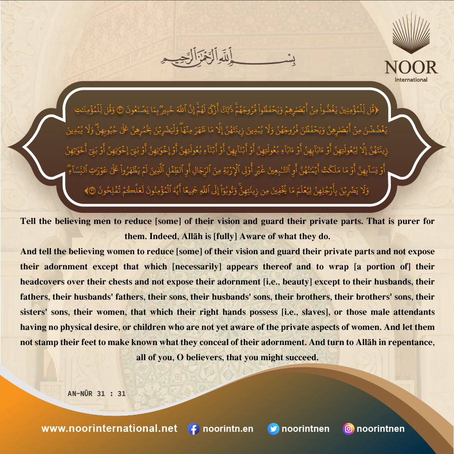 Tell the believing men to reduce [some] of their vision and guard their private parts. That is purer for them. Indeed, Allah is [fully] Aware of what they do.And tell the believing women to reduce [some] of their vision and guard their private parts and not expose their adornment except that which [necessarily] appears thereof and to wrap [a portion of] their headcovers over their chests and not expose their adornment [i.e., beauty] except to their husbands, their fathers, their husbands' fathers, their sons, their husbands' sons, their brothers, their brothers' sons, their sisters' sons, their women, that which their right hands possess [i.e., slaves], or those male attendants having no physical desire, or children who are not yet aware of the private aspects of women. And let them not stamp their feet to make known what they conceal of their adornment. And turn to Allah in repentance, all of you, O believers, that you might succeed.